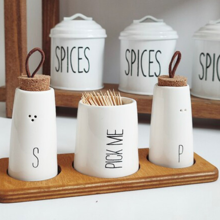 ست نمکدان و جا خلالی سرامیکی با زیره چوبی