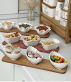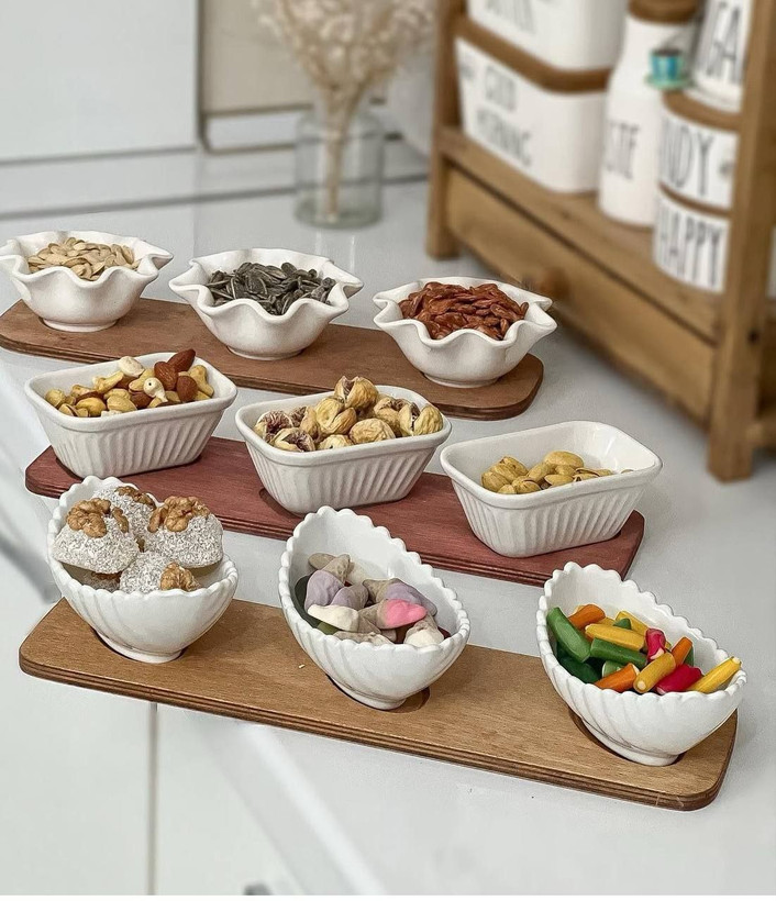متاسفانه این کالا در حال حاضر موجود نیست. میتوانید از طریق لیست بالای صفحه، از محصولات مشابه این کالا دیدن نمایید.در تصویر بالا، یک ست بسیار زیبا و شیک از پیالههای سرامیکی سفید رنگ را مشاهده میکنید که مناسب سرو تنقلات، خشکبار، شیرینی و خوراکیهای متنوع است. این مجموعه شامل پیالههایی با طراحی خاص لبهدار و فرمهای متنوع (گرد، بیضی و چهارگوش) میباشد که روی سینیهای چوبی با رنگهای گرم قرار گرفتهاند.